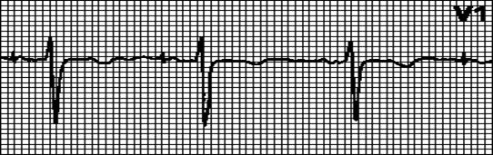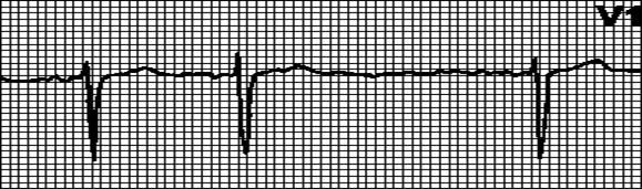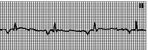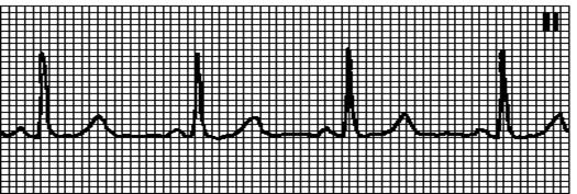 Периодическое выпадение комплексов QRS. Интервалы PQ одинаковы. узкие комплексы QRS более характерны для АВ-блокады типа Мобитц I, широкие — для АВ-блокады типа Мобитц II. При АВ-блокаде высокой степени выпадают два и более последовательных желудочковых комплекса.