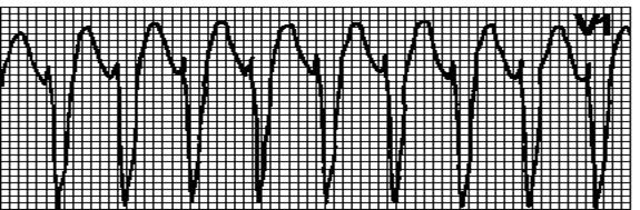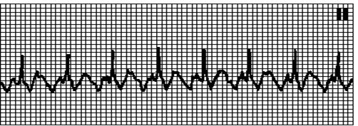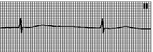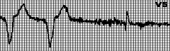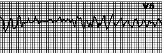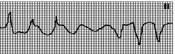 Хаотичный неправильный ритм, комплексы QRS и зубцы T отсутствуют.