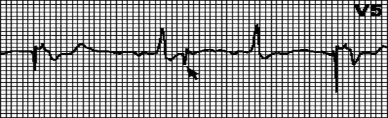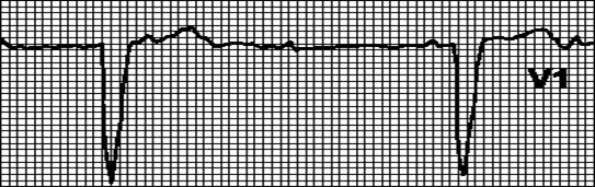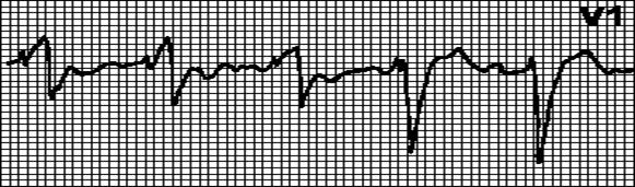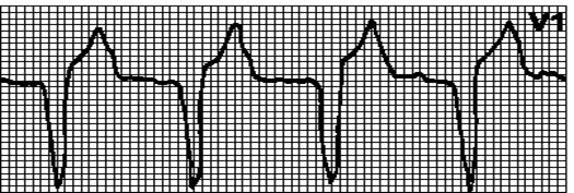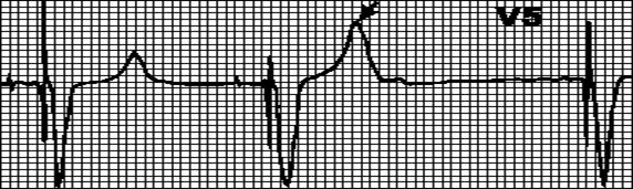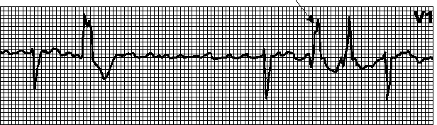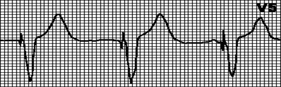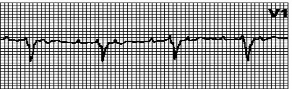 Внеочередной, широкий (> 0,12”), деформированный комплекс QRS. Сегмент ST и зубец T дискордантны комплексу QRS.