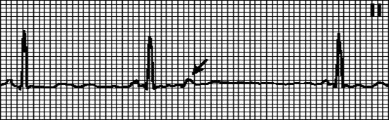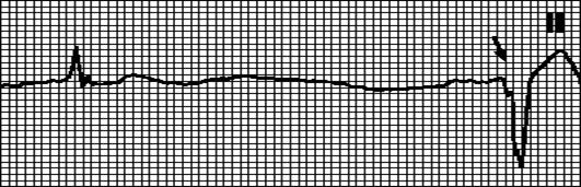 Внеочередной не синусовый зубец P, комплекс QRS отсутствует. Через АВ - узел, находящийся в периоде рефрактерности, предсердная экстрасистола не проводится. Экстрасистолический зубец P иногда наслаивается на зубец T, в этих случаях блокированную предсердную экстрасистолу ошибочно принимают за синоатриальную блокаду или остановку синусового узла.