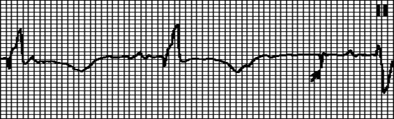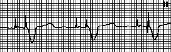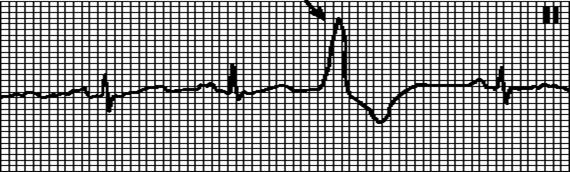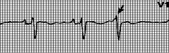 Внеочередной не синусовый зубец P, за которым следует нормальный или аберрантный комплекс QRS. Интервал PQ = 0,12”—0,20”. Интервал PQ ранней экстрасистолы может превышать 0,20”.