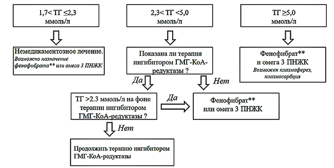Примечание. Омега3 ПНЖК – Омега-3 кислоты этиловых эфиров, включая другие эфиры и кислоты, в дозе 2-4 г/сут. При тяжелой гипертриглицеридемии рассмотреть вопрос использования плазмафереза, плазмосорбции.