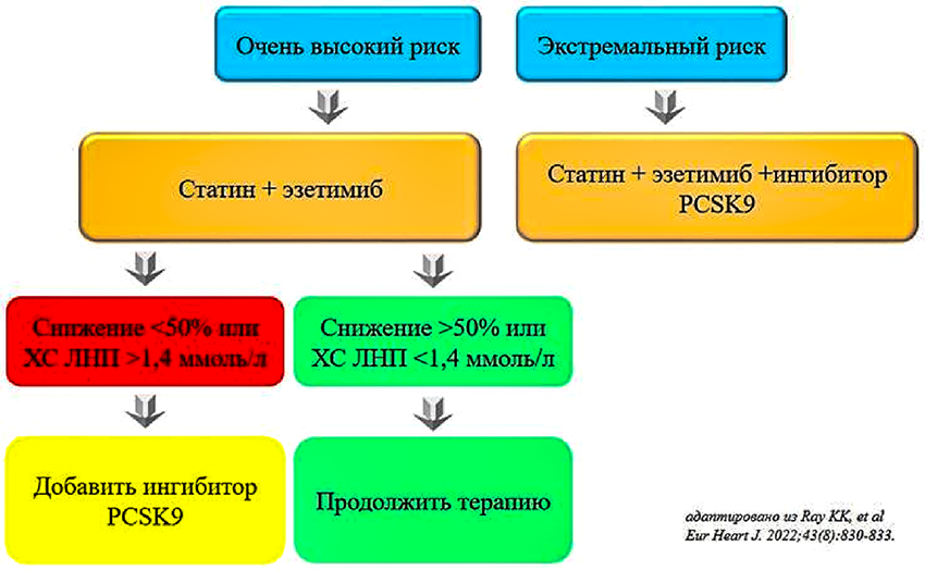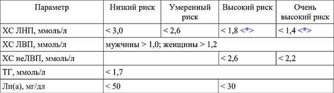 Повышенные уровни ТГ и низкий уровень ХС ЛВП синергично увеличивают риск сердечно-сосудистых событий у пациентов с уже достигнутыми ЦУ ХС ЛНП (< 2,1 ммоль/л) [17].