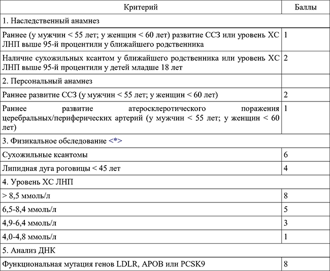 <*> исключают друг друга (т. е. максимум 6 баллов). ССЗ – сердечно-сосудистое заболевание, ХС ЛНП – холестерин липопротеидов низкой плотности, СГХС – семейная гиперхолестеринемия.