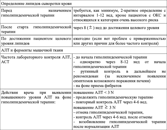 После старта или изменения дозировок гиполипидемической терапии необходим контроль липидов сыворотки через 8 недель до достижения целевого уровня липидов, далее ежегодно (если нет проблем с приверженностью или других причин для более частого контроля).