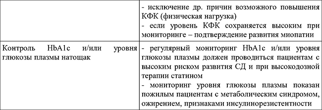 Регулярный мониторинг HbA1c и/или уровня глюкозы плазмы должен проводиться пациентам с высоким риском развития СД и при высокодозной терапии статинами.