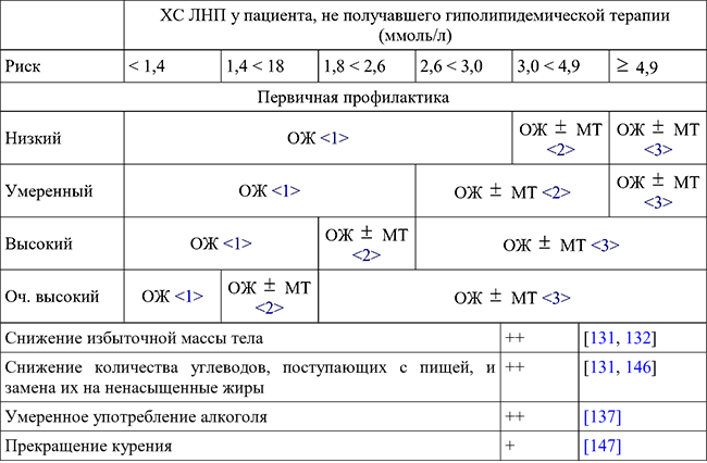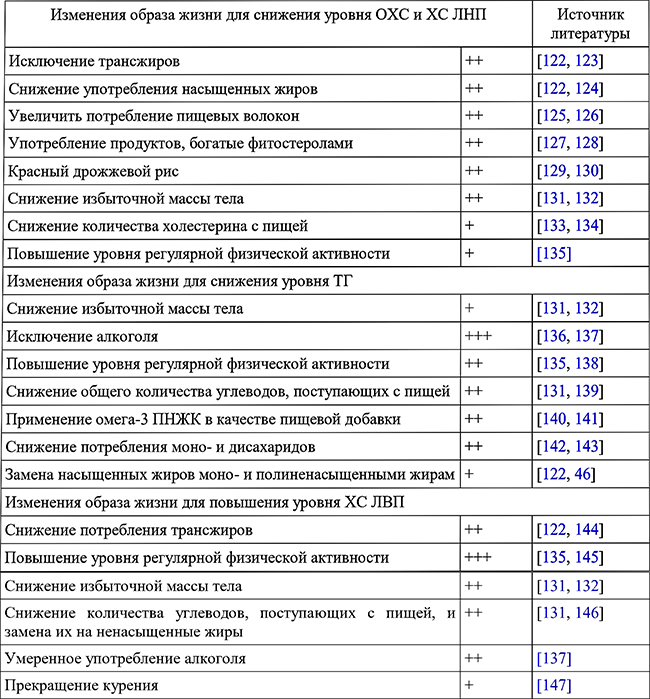 Примечание: +++ Общее соглашение об эффективности влияния на уровень липидов. ++ Менее выраженное влияние на уровень липидов; имеющиеся свидетельства/мнения специалистов указывают на эффективность мероприятий. + Противоречивые сведения.